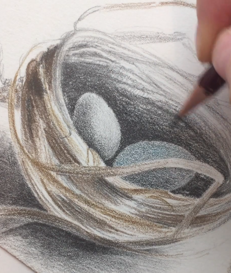 Just a hint of blue on the eggs and a hint of brown on the nest. Here is a little bit of how I draw, when I'm working on my own artwork. I layer really lightly and slowly, so building up a drawing takes time. This one probably took me about 3 hours total (but to be honest, I don't usually time my drawings, because it all takes so long it'd be depressing!). Sorry for the bad sound quality, I just recorded this one at my work studio with my phone camera, so it isn't as high a quality as my regular videos.