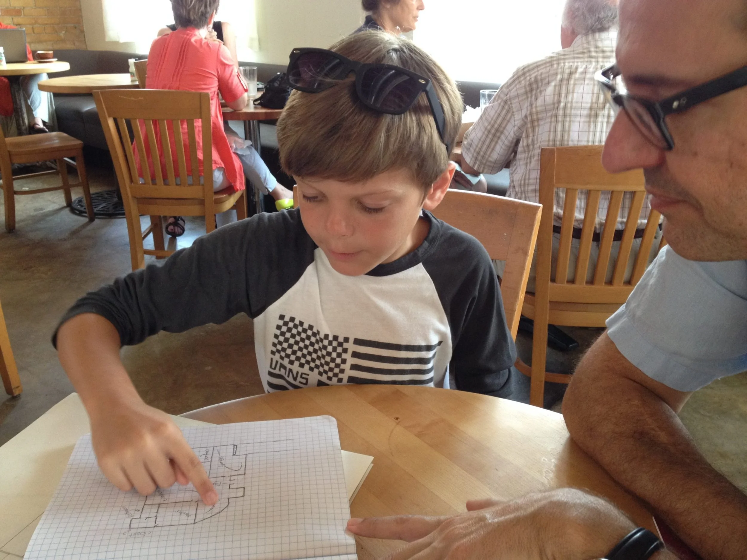 After that, we toured the garden that links the site to the neighboring cafe. The garden is under construction as well and is being designed by Teneyck Landscape Architects and Di Piazza Cobb Architecture. We then headed next door to the cafe to look at Carter's perspective drawings we've been working on in his lessons. He surprised me and brought a sketchbook where he's been creating his own floor plans! He hadn't shown me these before, amongst the other drawings he'd brought in to share with me! That was awesome to talk about together. We talked about what schooling it takes to become an architect and what it takes to get licensed as an architect as well.